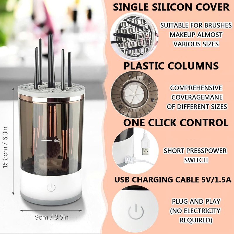 - First Ever Time & Energy Saving Electric Makeup Brush Cleaner-- No assembly required, large capacity, automatically clean multiple makeup brushes at once and works with almost all sizes of makeup brushers. Still handly clean your makeup brush by rubbbing them on a makeup brush cleaner mat? Or use an old style electric makeup brush cleaner that only cleans one makeup brush at a time and requires hand-holding all the time. Time to pick this newest makeup brush cleaner, it is sure to impress you.