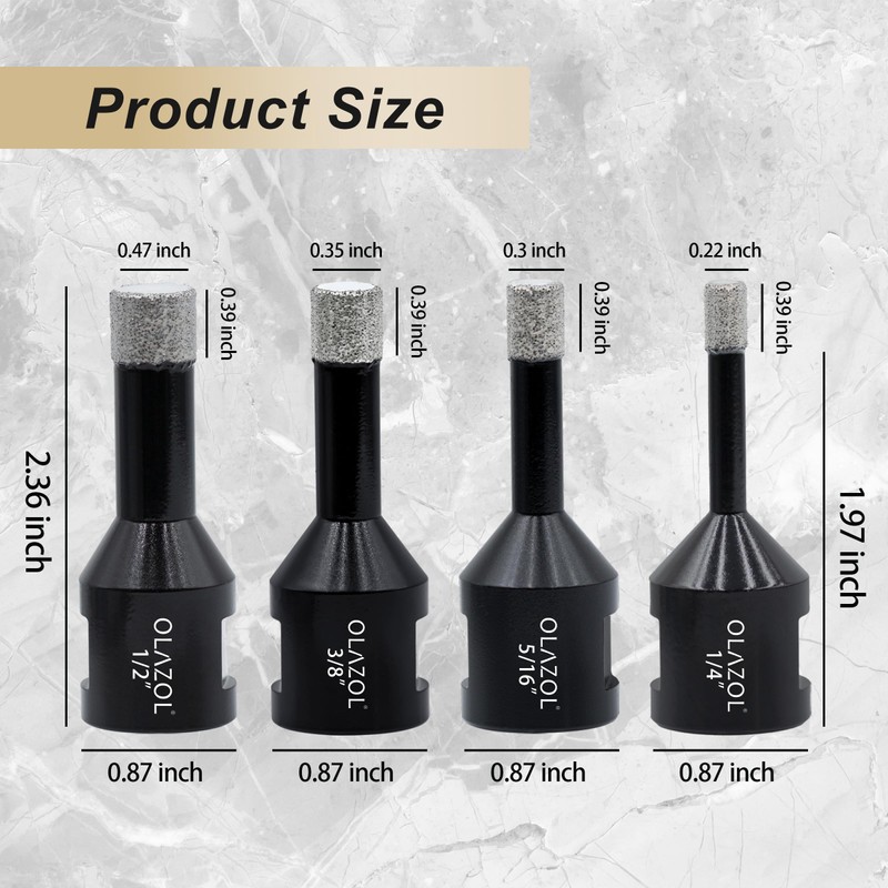 Olazol Drill bits is made of high-strength carbon steel with a smooth nickel-plated surface for extended service life. Coated with high quality diamond to increase drilling speed and achieve sharp, high precision and smooth cuts in seconds without breaking edges.Suitable for applying to tiles, ceramics, marble, glass (except tempered glass).Drive type: suitable for any electric drill, hand drill, bench drill, when using an angle grinder, please install the angle grinder drill chuck.Quantity: 4-piece diamond hole saw set.Package Includes:1/4 inch, 5/16 inch , 3/8 inch and 1/2 inch. Meet most of your different needs. 1. It is best to wear goggles while working to avoid flying debris. Keep eyes and objects away from the working position. 2. Vertical hard tops and vertical presses are prohibited and will greatly reduce service life.. 3. When you open the hole dry, first tilt 45 degrees to position, hit the crescent shape and then hit it vertically to prevent slipping. 4. We recommend using high power and high speed drills, the faster the speed, the more holes will be opened. When drilling vertically, it is easier to remove chips and speed up the drilling speed by slightly shaking the drill.