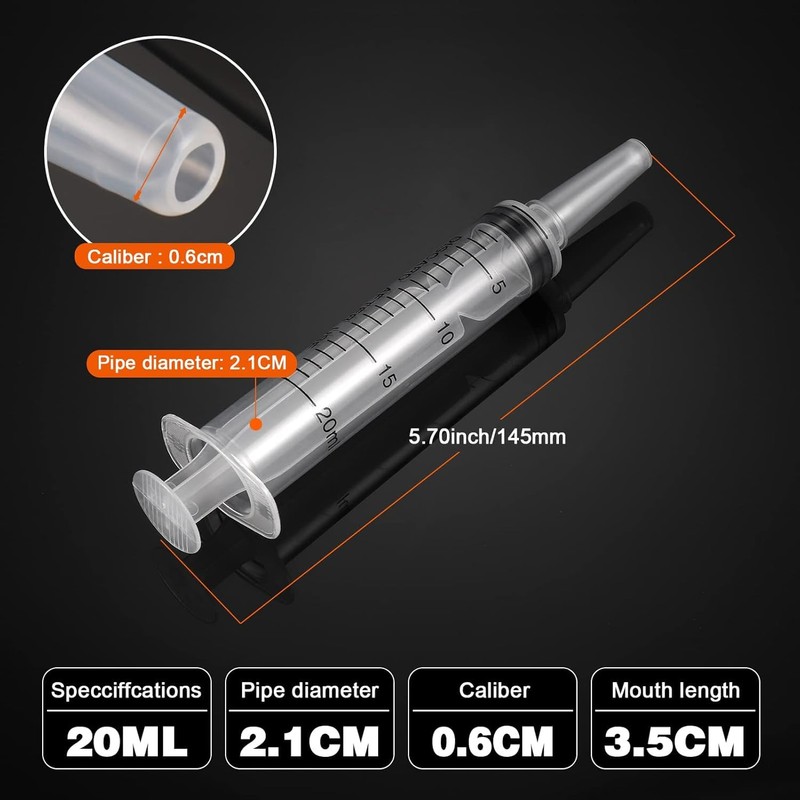 • SPECIFICATIONS - 6x syringes, capacity 20ml/cc, caliber: 0.6mm. Mouth length: 3mm