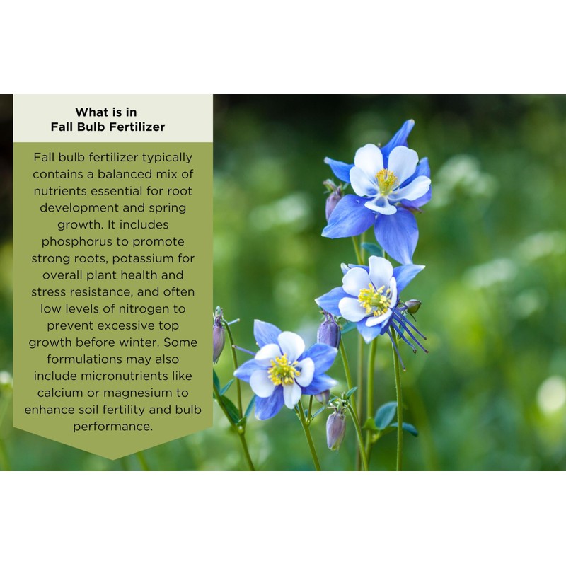 Enhance the beauty of your spring garden with the Old Cobblers Farm Fall Bulb Fertilizer, specifically designed for root development, seed development, and plant growth. This 5-10-10 NPK Ratio fertilizer, available in granule form, is perfect for all types of spring-flowering bulbs such as tulips, daffodils, crocuses, and lilies. The higher phosphorus and potassium content promotes strong root development, helps bulbs survive winter, and supports healthy flowering, ensuring vibrant, long-lasting flowers. Formulated for fall planting, it provides the right nutrients at the right time for a stunning spring display. Made from natural ingredients, it's safe for the environment and ideal for organic gardening.