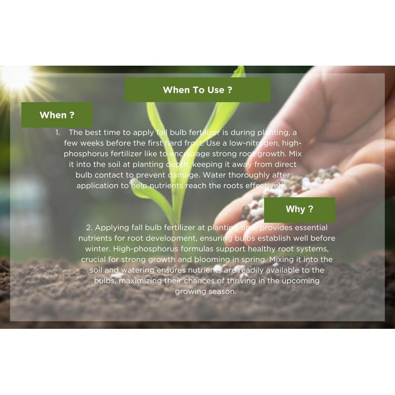• Robust Root Development: The 5% nitrogen (N) content enhances root growth, allowing bulbs to anchor themselves better and access essential nutrients