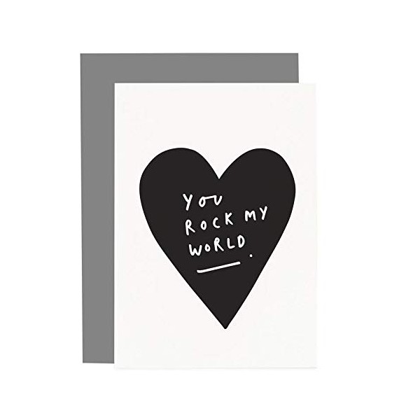 A simple, bold and motivating hand lettered card that reads 'you rock my world' in a black heart silhouette.