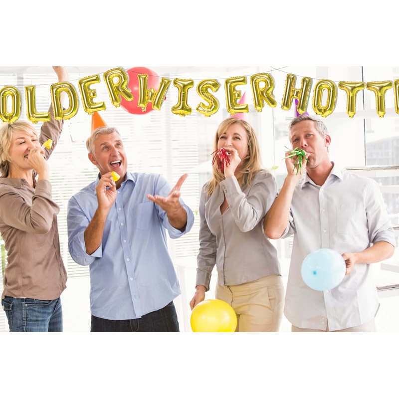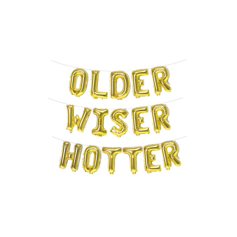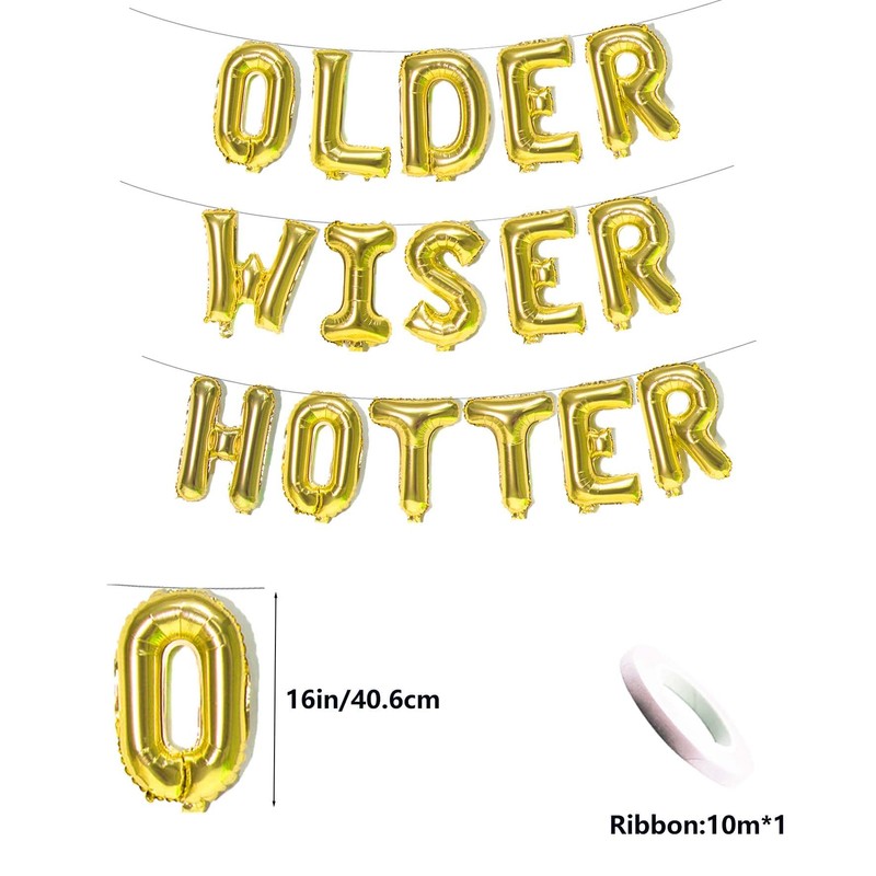 - Package included: 1* "Older Wiser Hotter" letter foil balloons in black/ silver/ gold/ rose gold color, 1 straw for inflating balloons, 1 ribbons.