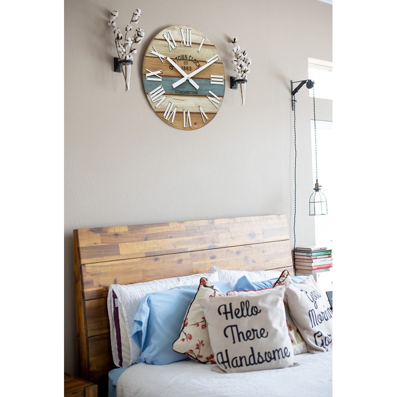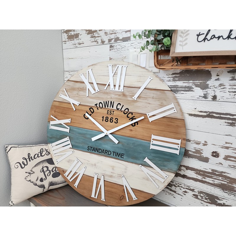- PAINTED ON WOOD - multi-colored painted on fir skin engineered wood with screw on wooden white roman letterings. This is an open face wood crafted round clock with hues of natural wood. This clock is the perfect addition to any nautical, coastal, urban beach-chic décor.