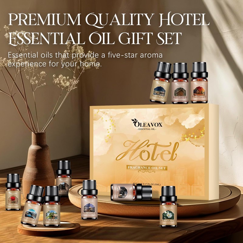 Hotel Essential Oil Set - Transform Your Space into a Luxurious Retreat Elevate your home experience with our exquisite Hotel Essential Oil Set, a curated collection of ten sumptuous fragrances designed to transport you to a world of sophistication and comfort. Inspired by the luxury of elite hotels, this set features captivating scents such as Cabana, November, Dark Velvet, Crystall, Dream On, My Way, White Tea, Desert Rose, Magic, and Mystara. Each aroma is crafted to envelop your space with a rich, long-lasting fragrance that rejuvenates your environment and soothes your senses. Premium Quality & Long-Lasting Aroma Our meticulously formulated oils are made from highly concentrated, premium essential oils, ensuring a refreshing and uplifting ambiance in your home. Each drop brings the crisp, clean scent reminiscent of a five-star lobby, offering an effortless way to enhance your sanctuary. Free from harmful additives such as parabens and phthalates, these essential oils are perfect for those who value quality and well-being. Ultimate Versatility for DIY & Home Use Designed not only for use in diffusers but also ideal for candle making, soap crafting, and reed diffusers, this essential oil set provides unparalleled versatility for your creative projects. Unlock your imagination and customize your aromatic experiences with these luxurious fragrance oils. Indulge in the timeless allure of our Hotel Essential Oil Set and transform your everyday moments into luxury escapes. Perfect for personal use or as a thoughtful gift for any occasion, this essential oil gift set is a must-have for fragrance enthusiasts and DIY crafters alike. Elevate your space today!