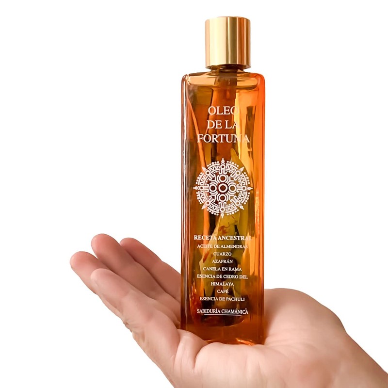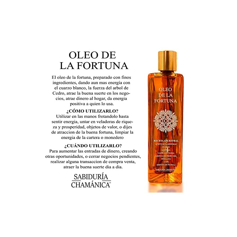 - El oleo de la fortuna, preparado con finos ingredientes, dando aun mas energía con el cuarzo blanco, la fuerza del arbol de Cedro, atrae la buena suerte en los negocios, atrae dinero al hogar, da energía positiva a quien lo usa.