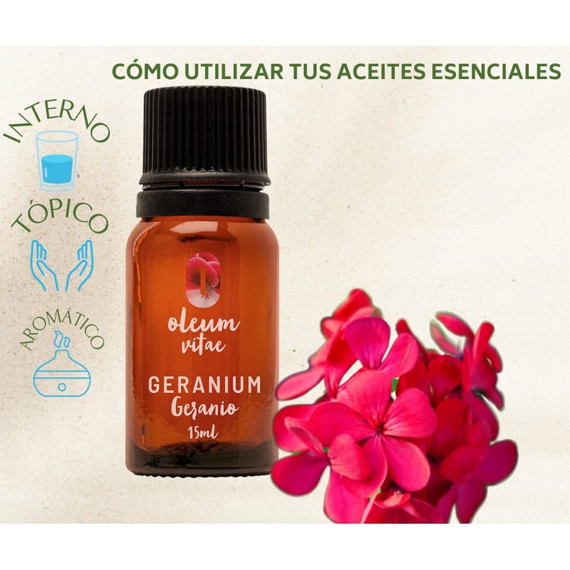 OLEUM VITAE Aceite Esencial de Geranio. Pelargonium Graveolens. 100% Puro y Orgánico. Certificado USDA ORGANIC. Aplicación Interna, Externa y Aromática. 15ml