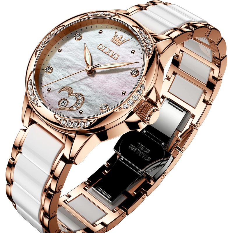 OLEVS Automatic Watch for Women Self Winding Mechanical Ladies Diamond Wrist Watch Luxury Dress Rose Gold Ceramic Watches for Women Love Heart Date