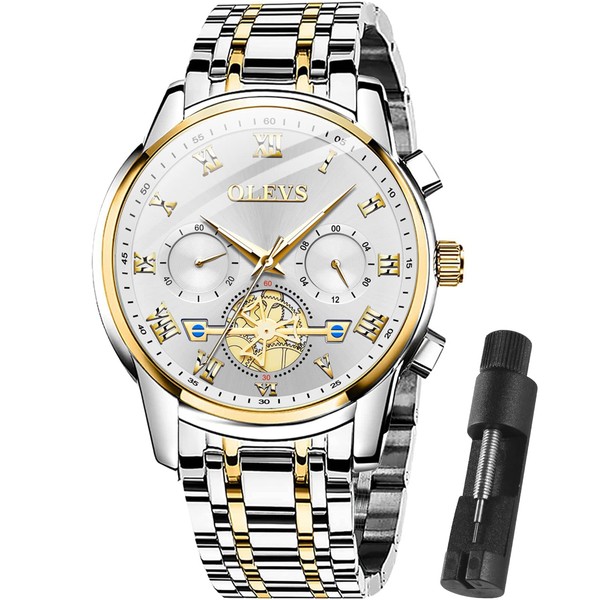 OLEVS Men Multifunction Watch, Multi Dial Waterproof Luminous Chronograph Men's Watch with Date Gift for Men, gold and White, ROUND, Business