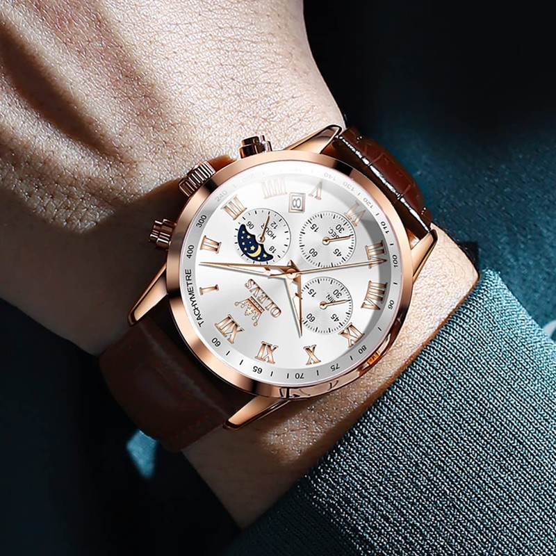 - Multi-functional Men's Watch: Quartz dial with moon phase calendar, seconds, minute timer function, and a highly hardened glass mirror for excellent durability, scratch resistant, lightweight and cool