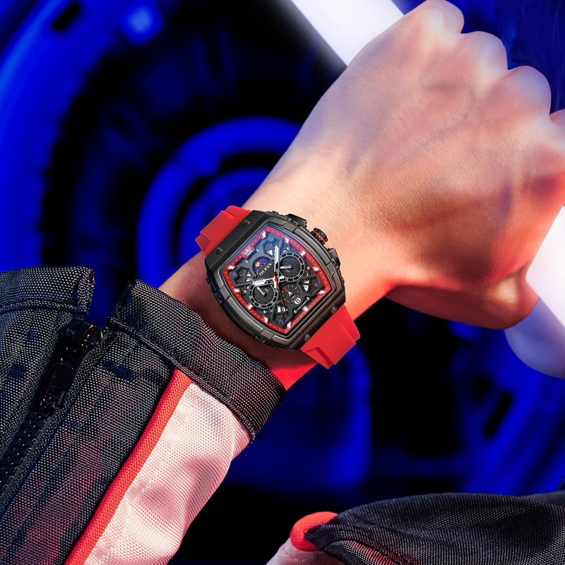 OLEVS Mens Watch Date Silica Gel Band Analog Quartz Watch Men Large Waterproof Chronograph Square, G2942JD-HHong, Modern