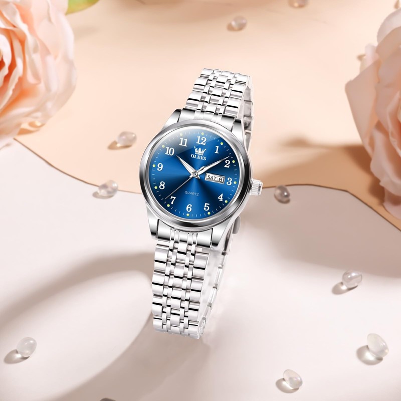 OLEVS Silver Watches For Women Fashoin Blue Dial Womens Watches Day Date Women Dress Watches Sliver Stainless Steel Ladies Watches Water Resistant Watches For Ladies Women Quartz Watches Relojes Para Mujer