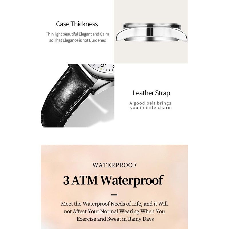 - Water Resistant: Designed for everyday wear, this watch is water-resistant to 3ATM, making it suitable for handling splashes, rain, and accidental water exposure. It can briefly immerse in water but is not suitable for deep diving, or hot water bathing.