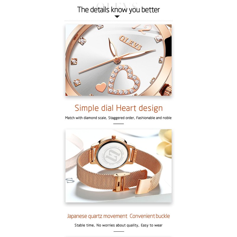 OLEVS Women's Rose Gold Watches Heart Diamond Japanese Quartz Movement Ladies Wristwatch Big Face Waterproof Mesh Belt Watch and Bracelet Set Valentines Day Gifts