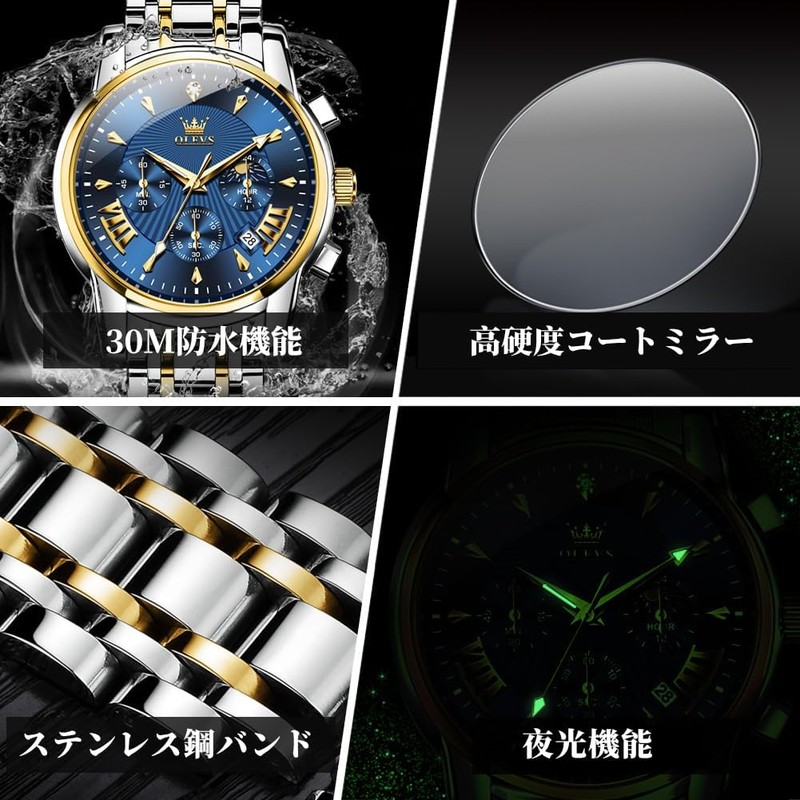 OLEVS Wristwatch, Men's, Stylish, Chronograph, Business Watch, Popular Brand, Large, Easy to Read Analog, Waterproof, Quartz Watch, blue-2892, Bracelet Type