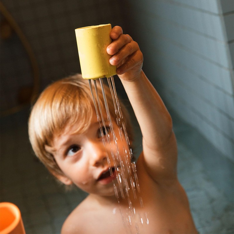 The Upcycled Boat Yellow is a sustainable, educational toy made from 100% recycled natural rubber. It includes 3 parts in 1 and is upcycled from food leftovers, giving waste a second life. This bath toy encourages imaginative play and supports fine and gross motor skills by stimulating physical activities where each part needs to be filled, stacked and drained with water. The toy is designed for babies (0+) and children who start to reach for things and play with them. It improves hand-eye coordination, problem solving skills and cognitive development through interaction in water play.