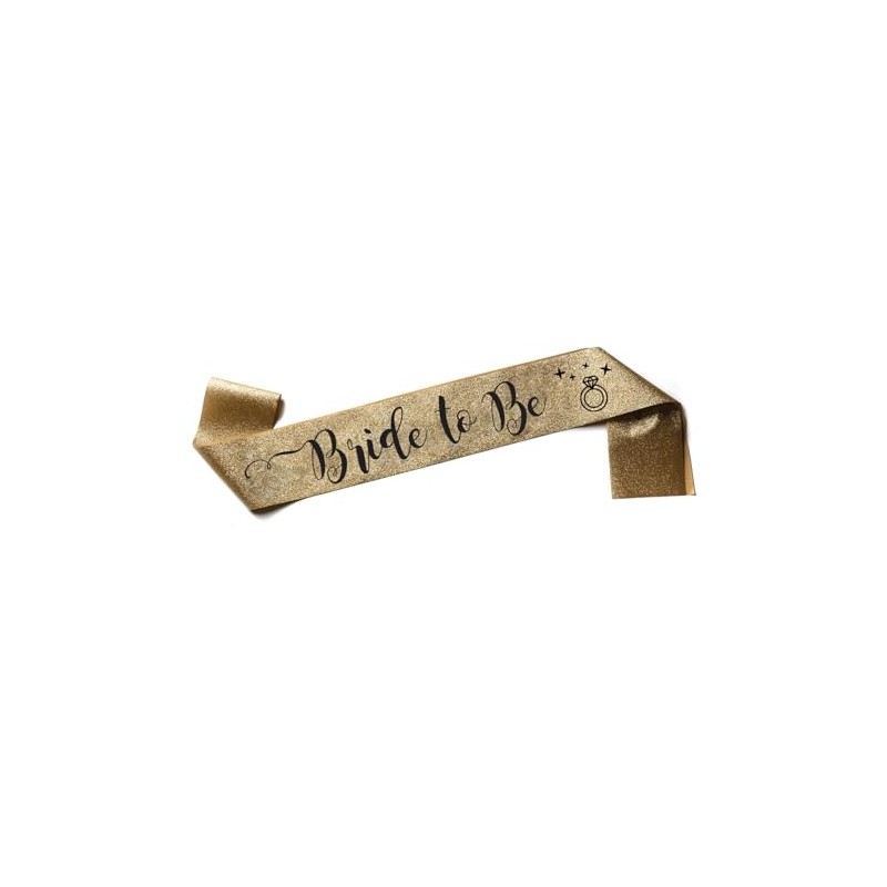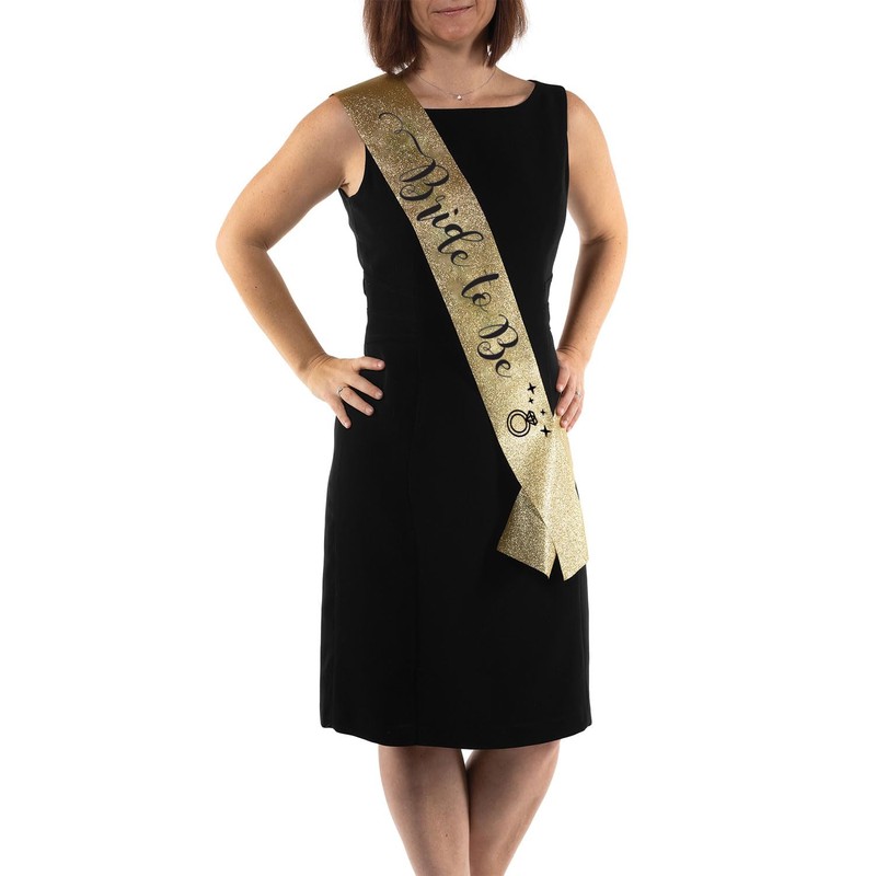 Wunderschöner Schal zum Verschenken an einer Party mit Freundinnen, um die zukünftige Hochzeit zu feiern. Der Schal ist aus dickem, satiniertem Stoff in Goldfarbe gefertigt. Die Aufschrift "Bride to Be" ist in der Farbe Schwarz und in englischer Sprache.