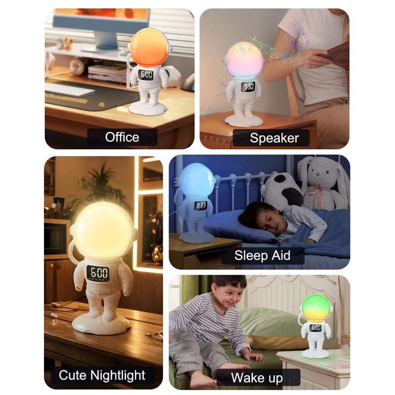 - 【22 Mood Lights + 21 White Noise】This astronaut sunrise alarm clock features 22 lighting modes, including 16 solid colors and 6 dynamic mood lights. It also offers 21 soothing white noise options with 16 adjustable volume levels, and supports auto-off timers (15-90 minutes), making it perfect for various scenarios like reading, sleeping, or setting the right ambiance.