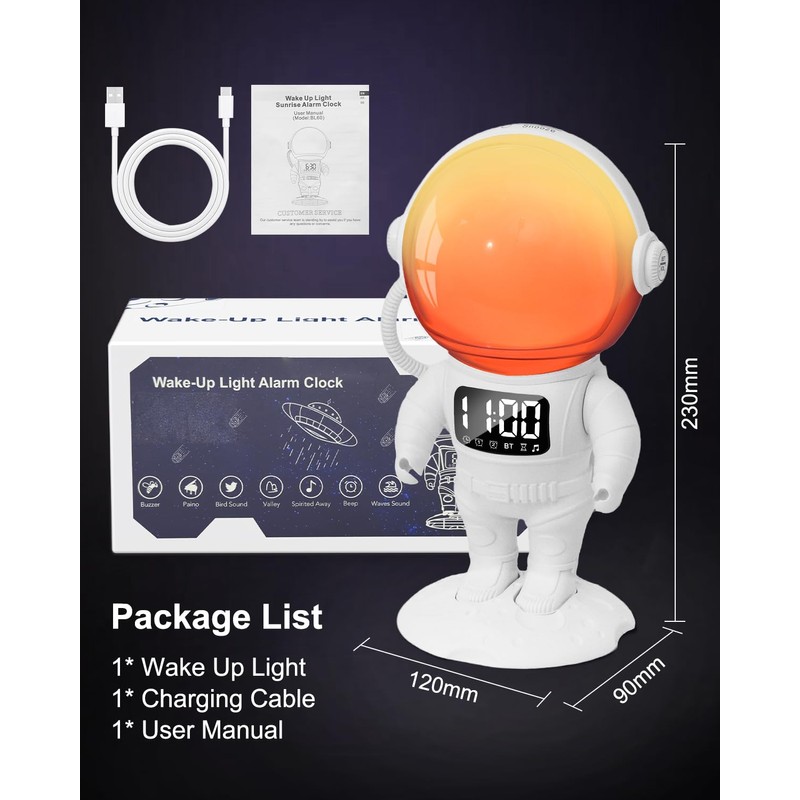 - 【Timed Sunrise Wake Up】The Astronaut Wake Up Light simulates a natural sunrise by gradually brightening from 1% to 100% daylight white over a period of 10 to 120 minutes. This Sunrise Alarm Clock reduces grogginess by providing a shock-free awakening, replacing jarring alarms with a soothing, light-based ritual.