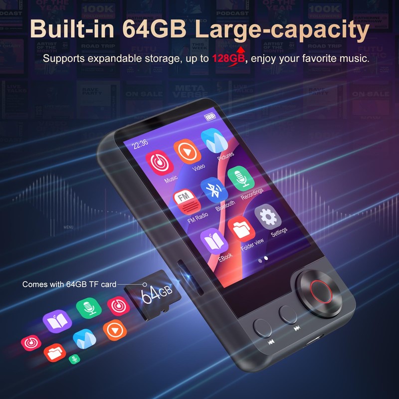 - 【64GB MP3 Player Supports Micro SD Card Up to 64GB】This Bluetooth music player has 64GB memory and built-in Micro SD card slot, supports up to 64GB of expanded memory (comes with a 64GB memory card), the maximum memory can reach 128GB, so you can easily put all your favorite songs on this MP3 player without worrying about the memory capacity.