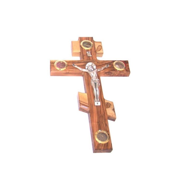 Olive Wood Patriarchal Three bar Crucifix with Holy Land Samples. (25cm or 10 inch) with Certificate - Lord Prayer Card