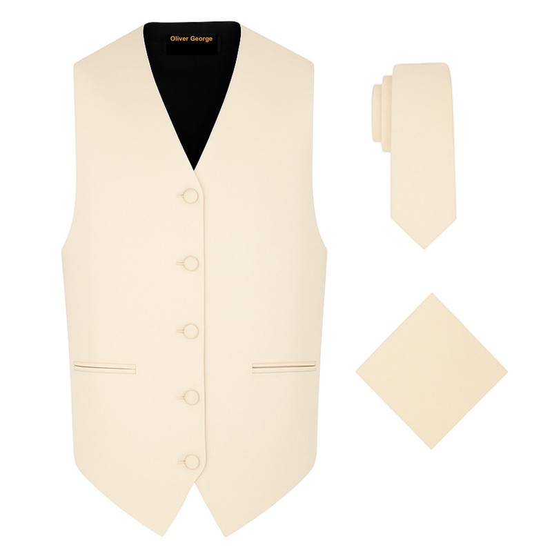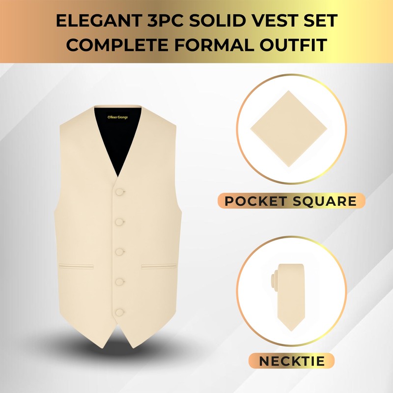 Oliver George 3pc Men's Vest and Tie Set For Men + Handkerchief | Men's Tuxedo and Suit Vest | Solid Formal Waistcoat | Beige Medium