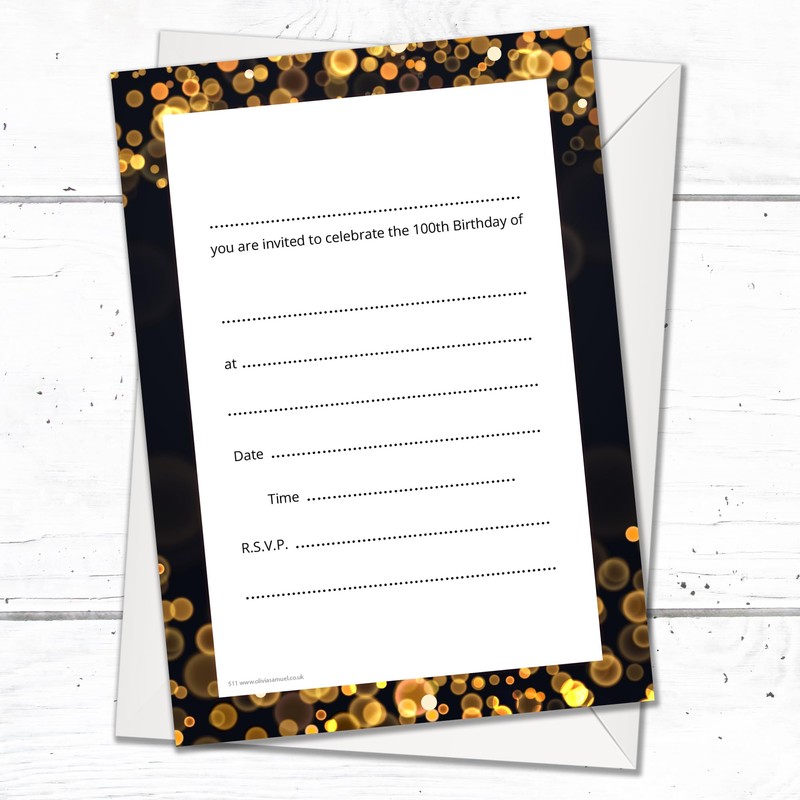 Olivia Samuel 20 x 100th Birthday Party Invitations with Envelopes - Ready to Write - Black and Gold Effect - Designed and Printed in the UK