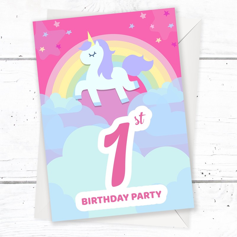 - 1ST BIRTHDAY PARTY INVITATIONS - PACK OF 20 ⭐ Pretty Unicorn and Rainbow Design ⭐ Professionally printed both sides