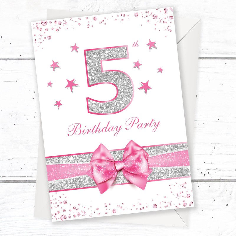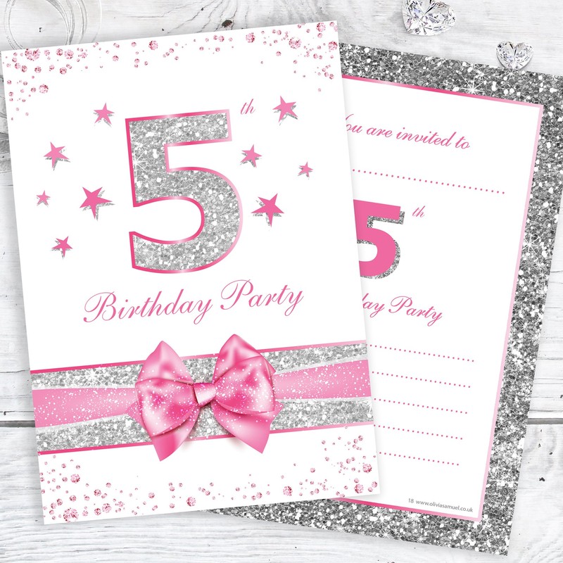 Olivia Samuel 20 x 5th Birthday Party Invitations from Pink Sparkly Design and Photo Effect Silver Glitter - A6 Postcard Size with envelopes