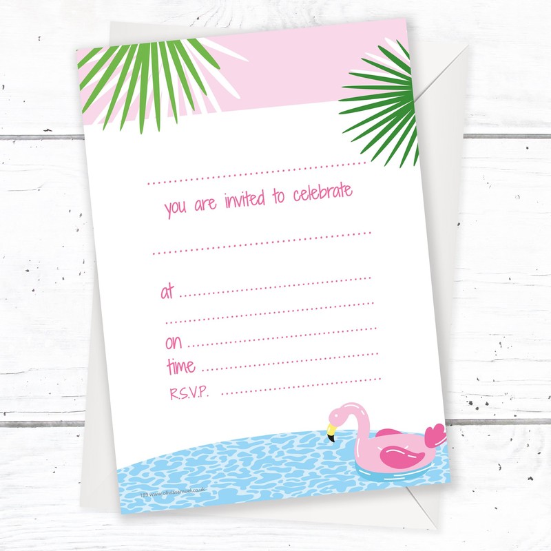 A pack of 20 high quality tropical pink style swimming pool party invitation cards and envelopes. Perfect for a fun splash filled birthday party celebration. The pink flamingo design will particularly suit a girls pool party birthday celebration. The A6 cards are ready for you to write your party details on the reverse. Printed and packaged in the UK by Olivia Samuel.