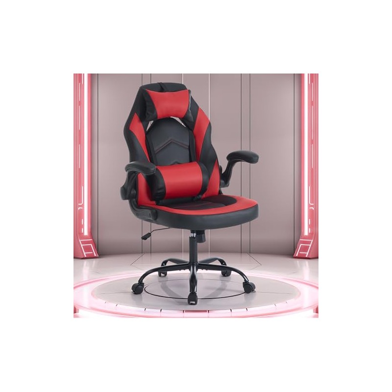 OLIXIS Computer Gaming Desk Chair - Ergonomic Video Game with Comfy Lumbar Support and headrest, PU Leather with Flip-up Arms, Adjustable Height and Swivel Wheels, for Adults, Red