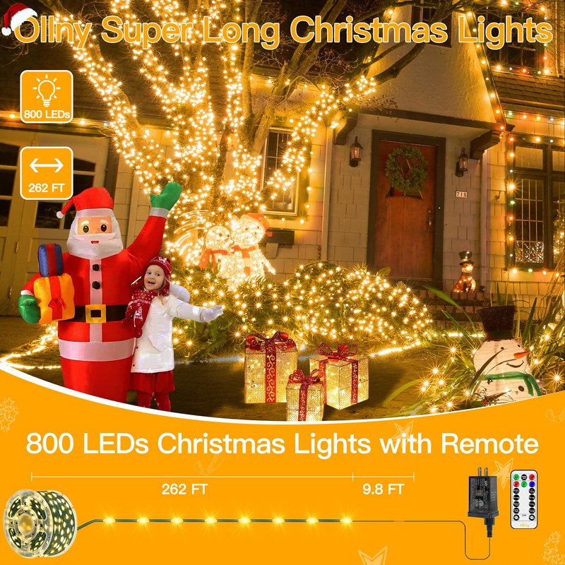 Ollny Christmas Lights 800 LED 262 FT Plug in, IP67 Waterproof Green Wire Outdoor Christmas Lights with Remote, 8 Modes and Timer Christmas Tree Lights for House Indoor Xmas Decorations (Warm White)