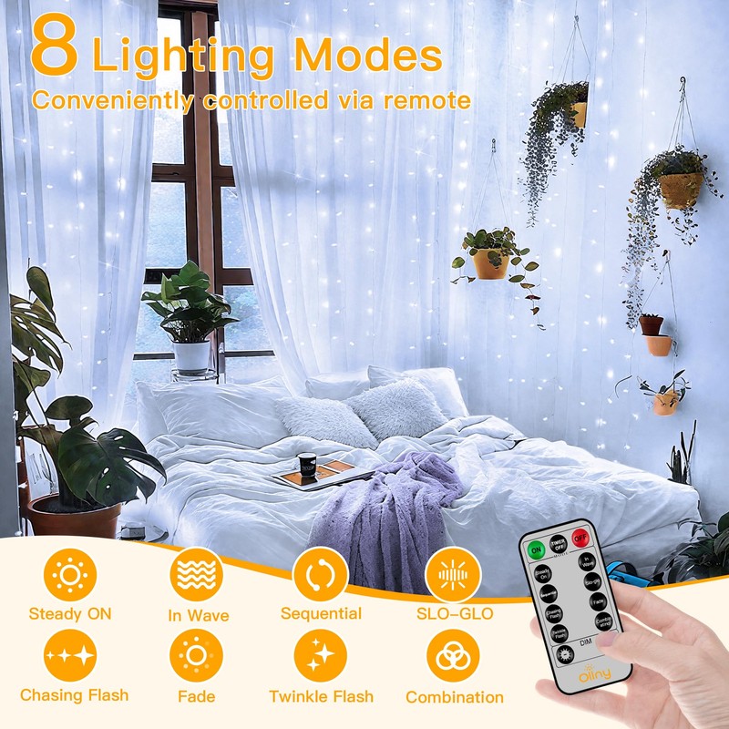 - [8 Modes Remote Controlled] Ollny curtain fairy lights has 8 lightning modes: steady on, in waves, sequential, slo-glo, chasing flash, slow fade, flash, combination and 4 brightness levels. Easily adjust the lighting modes by remote control to create a warm or romatic atmosphere