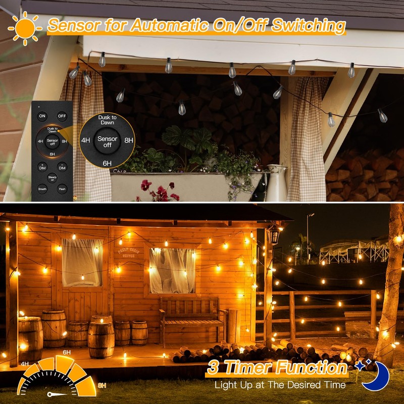 - [Intelligent Photosensitivity] Led string lights with automatic on/off sensors can be turned on automatically at dusk to create a warm ambiance and automatically turn off when the sensor detects daylight, saving money on electricity bills and extending the life