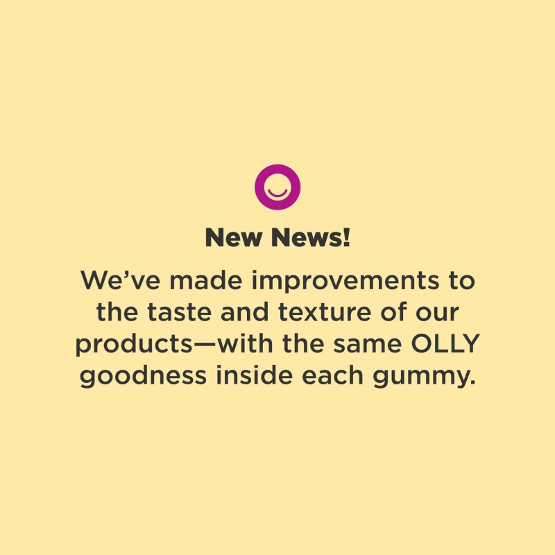 - NEW NEWS: We’ve made improvements to the taste and texture of our products—with the same OLLY goodness inside each gummy