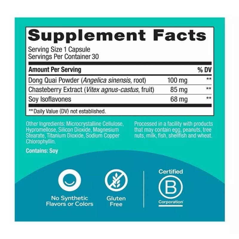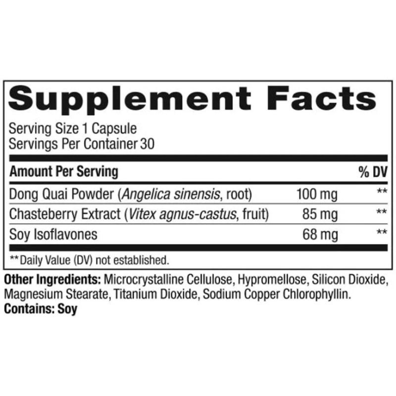 - Valores nutricionales por porción: Sauzgatillo, Isoflavonas, Dong quai 100mg