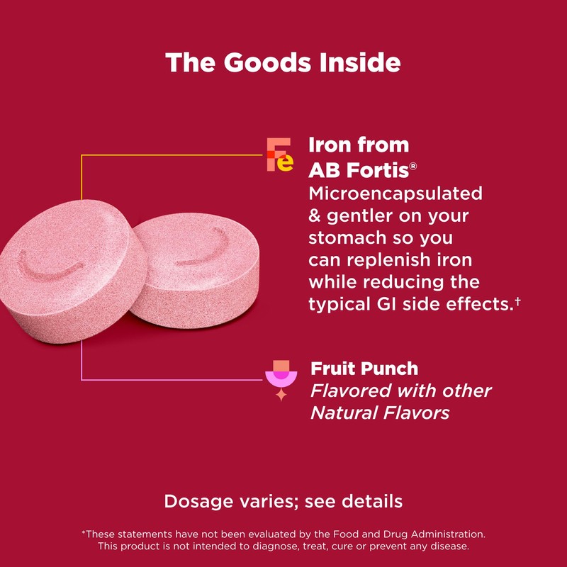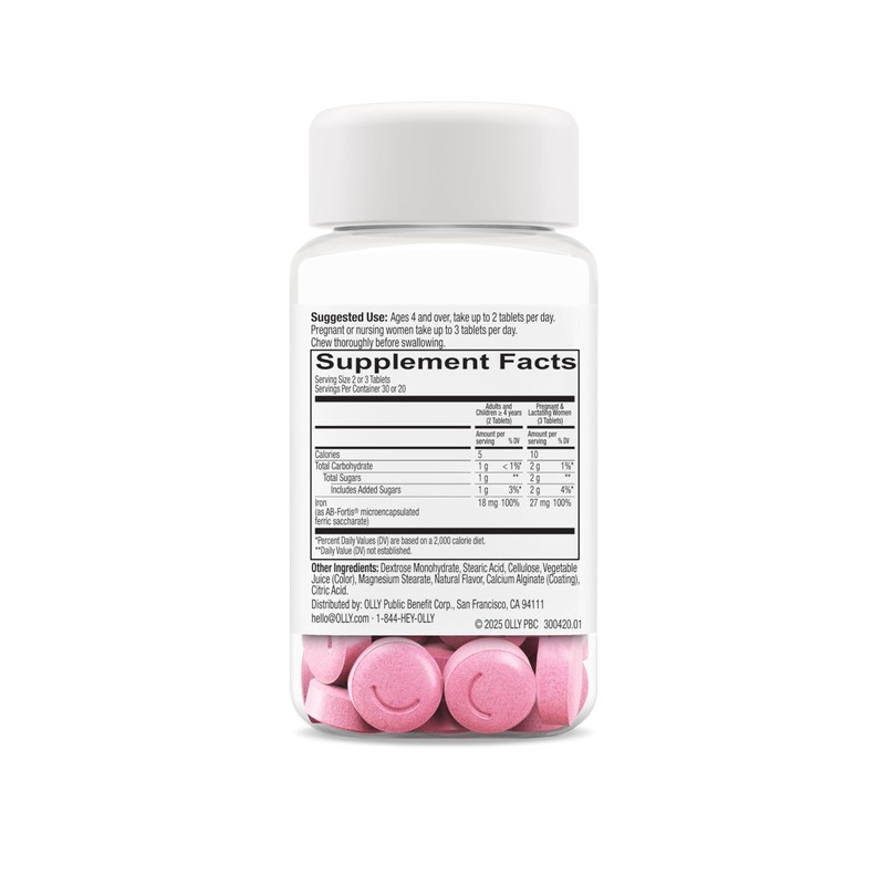 At OLLY, we're all about standing ironclad against fatigue. Replenishing your iron levels can help reduce the effects of iron deficiency like tiredness and fatigue.* A lack of iron can leave you feeling low on energy. That's because your cells count on oxygen for energy and iron helps ensure they get that oxygen. Here's how it works: Iron supports the production of red blood cells, which are responsible for transporting oxygen to your cells. Think of red blood cells as delivery trucks, ensuring oxygen reaches your cells. Iron from AB Fortis is microencapsulated, making it gentler on your stomach so you can replenish iron while reducing the typical GI side effects.? This formula is suitable for ages 4+, adults and pregnancymeaning the fam can get their iron on. Ages 4 and up take up to 2 tablets per day. Pregnant or nursing women take up to 3 tablets per day. Chew thoroughly before swallowing. These chewable tablets are a sweet blend of cherry, orange and pineapple flavors with other natural flavors. Formulated with no synthetic flavors or colors, vegan and gluten free. ? Microencapsulated Ferrous Saccharate has been shown to be gentler on the stomach compared to iron sulfate ?? Based on a 2024 ProVoice survey of Primary Care Physicians, who trust AB Fortis? as a form of iron for children, adults and pregnant women based on review of clinical studies? *These statements have not been evaluated by the Food and Drug Administration. This product is not intended to diagnose, treat, cure or prevent any disease.