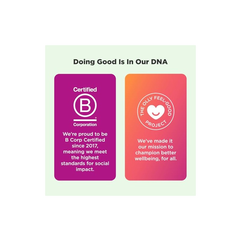 • HI THERE. WE'RE OLLY: We've made it our personal mission to make nutrition easy to understand, so you can pursue good health without compromise. Taking nutritional supplements shouldn't be a chore which is why ours are as effective as they are fun.