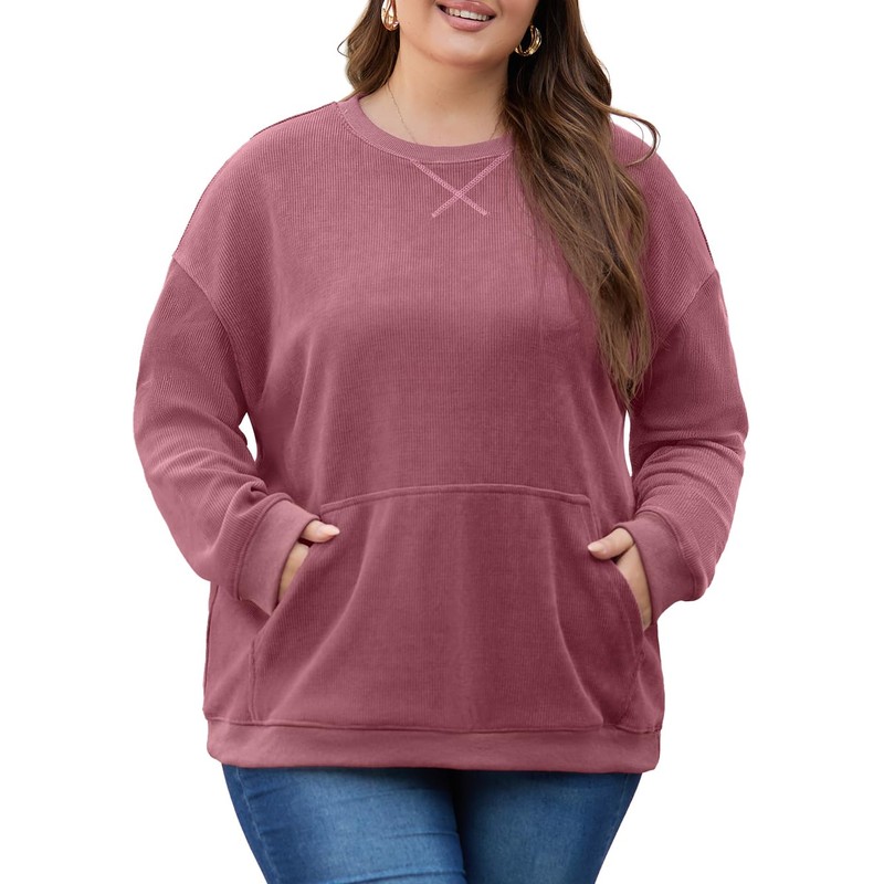 OLRIK Plus Size Sweatshirts for Women Corduroy Knit Long Sleeve Crew Neck Pullover with Pocket 2024 Trendy Sweater 1X-5X