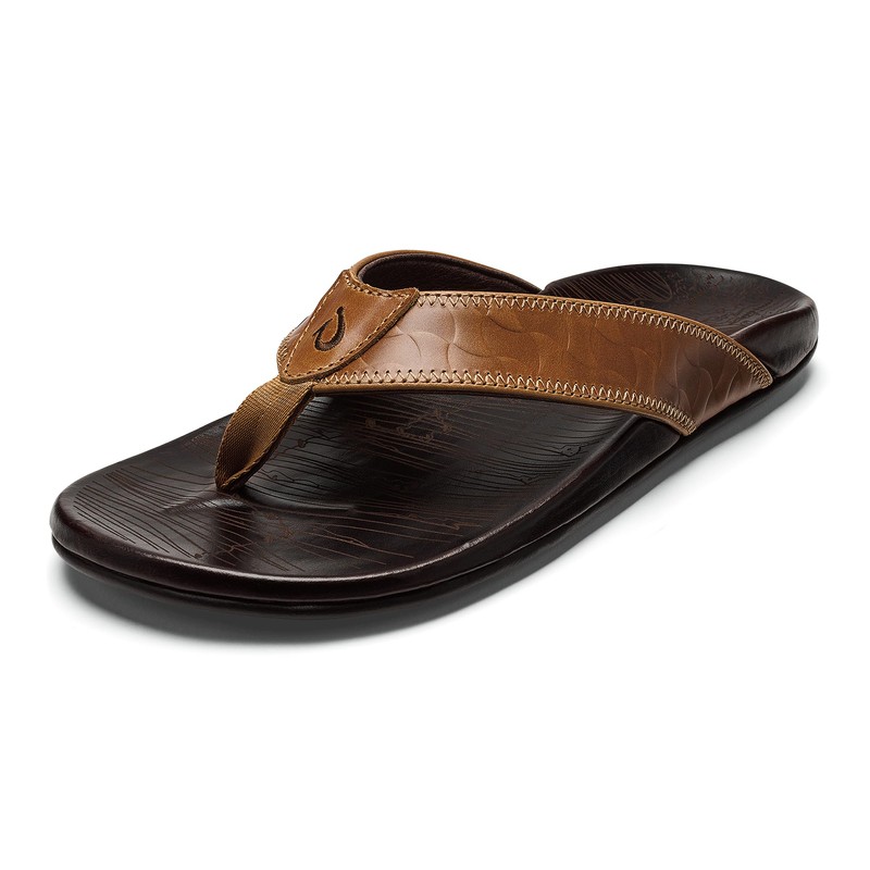 OLUKAI Hikianalia Men's Leather Sandal, Full-Grain Leather, Non-Marking Rubber Traction Pads & Compression Molded Footbed, Tan/Dk Java, 11