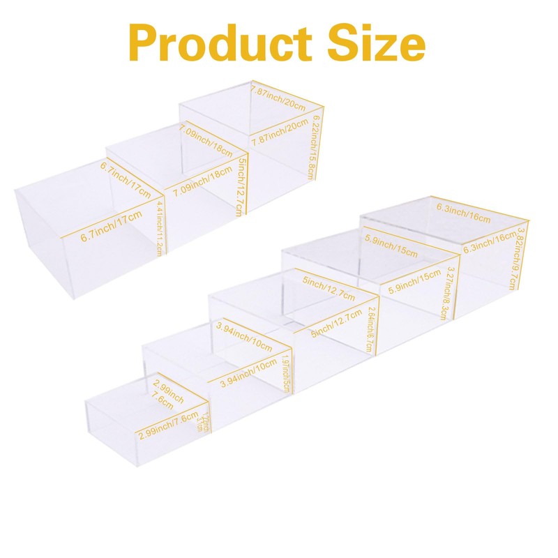 - PROPER SIZE - The maximum size of the acrylic display stand is 7.87 x 7.87 x 6.22 inches, and the minimum size is 2.99 x 2.99 x 1.22 inches. You can stack them up for saving space; Display nesting risers with hollow bottoms will make your everyday neat and accessible.