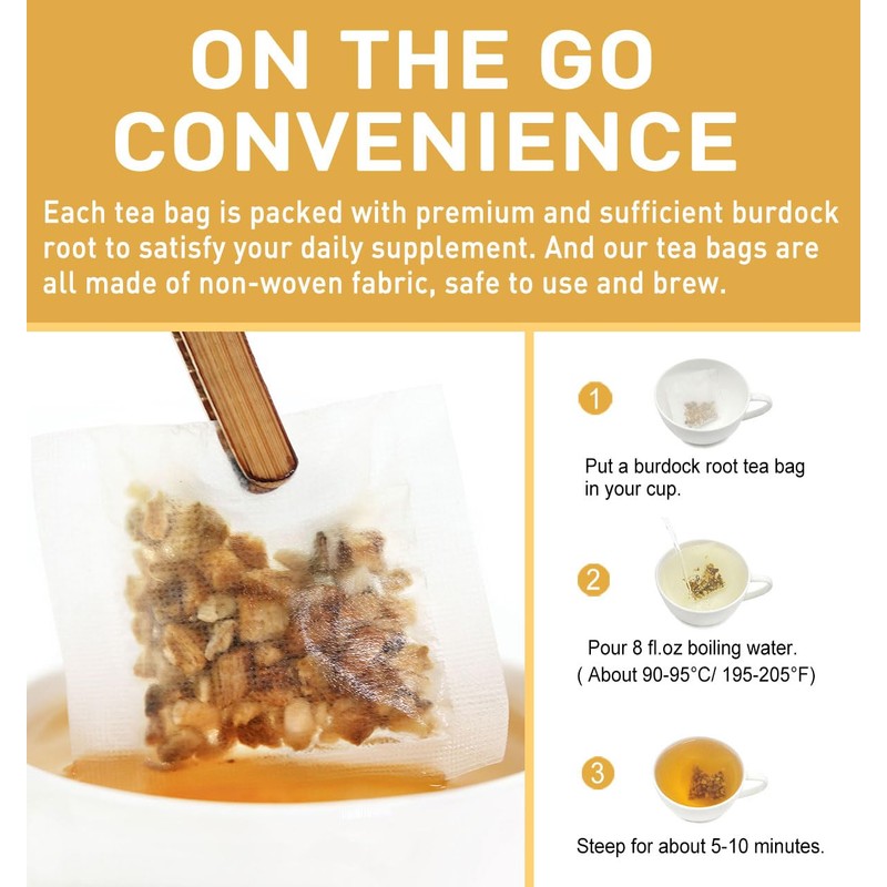 - EASY TO USE: 60 burdock root tea bags are placed in a resealable bag to keep them fresh. Just take one and place it in the cup, add 8 fl.oz of boiling water. Steep for about 5-10 minutes. Take out the tea bag then enjoy this burdock root tea;