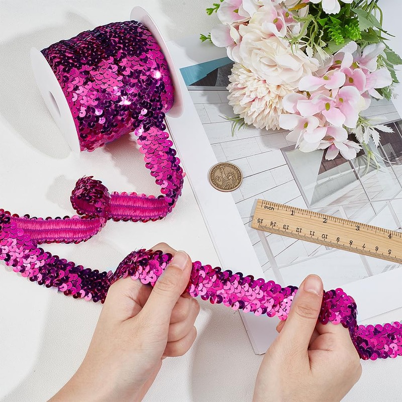 - Stretch Sequin Trim - Bling sequins are compactly sewn in 3 rows on an elastic band with long-lasting elasticity, so they can be sewn more easily on fabrics or wrapped for packaging.