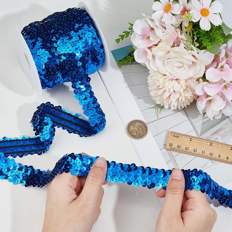 • 【Stretch Sequin Trim】--Bling blue sequins are sewn compactly in 3 rows on a rubber-band of long lasting elasticity, making it more easily to sew them on fabrics or wrap them for packing.