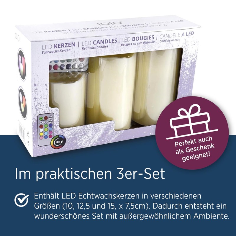 • PRAKTISCHES SET - Das 3er Set enth?lt LED Echtwachskerzen in verschiedenen Gr??en (10, 12,5, 15, ? 7,5cm). Dadurch entsteht ein wundersch?nes Set mit au?ergew?hnlichem Ambiente.