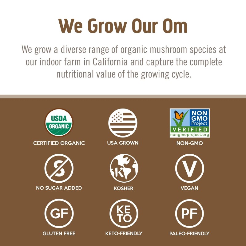 - USA Grown the Om Way: Om Mushroom Superfood Powders, Capsules, Hot Drinks, Energy Drinks and Broths are all produced in the USA. We grow, dry and mill our organic mushrooms into powders in our state of the art facilities in Southern California, to ensure the highest quality, and verify using 3rd-Party Testing. Om Mushroom powders are USDA Certified 100% organic, non-GMO, gluten-free, vegan, grown in the USA, paleo-friendly, keto-friendly, kosher