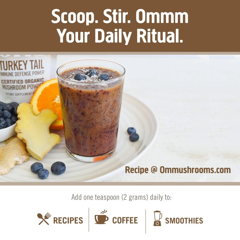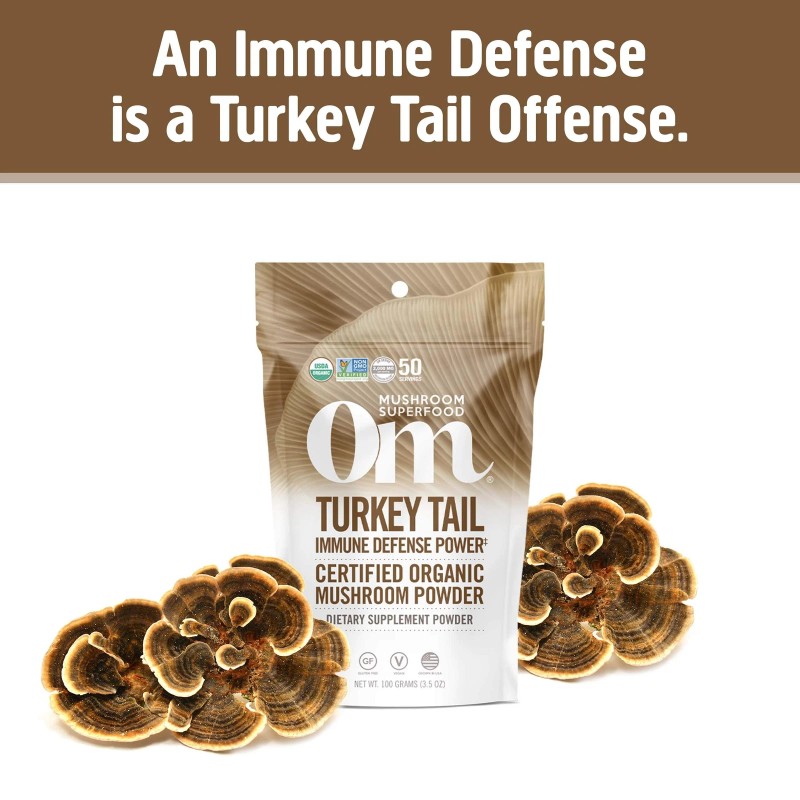 - Om Mushroom Superfood Turkey Tail Mushroom Powder: Contains one 3.5 ounce pouch (50 servings) of Turkey Tail mushroom powder superfood supplement. Each serving provides an efficacious dose of 2,000mg of functional mushrooms that contain powerful polysaccharides and beta glucans