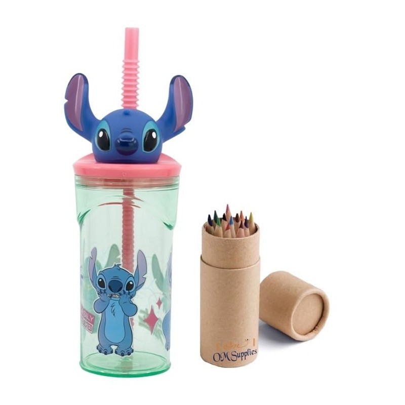 OM SUPPLIES Stitch 3D Figurine Cartoon Characters Reusable Tumbler Childrens Drinking Cup Straw 23 x 7.5 x 7.5cm Includes Half Size 12pcs Pencil Set (Stitch)