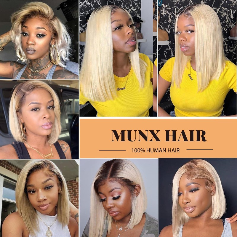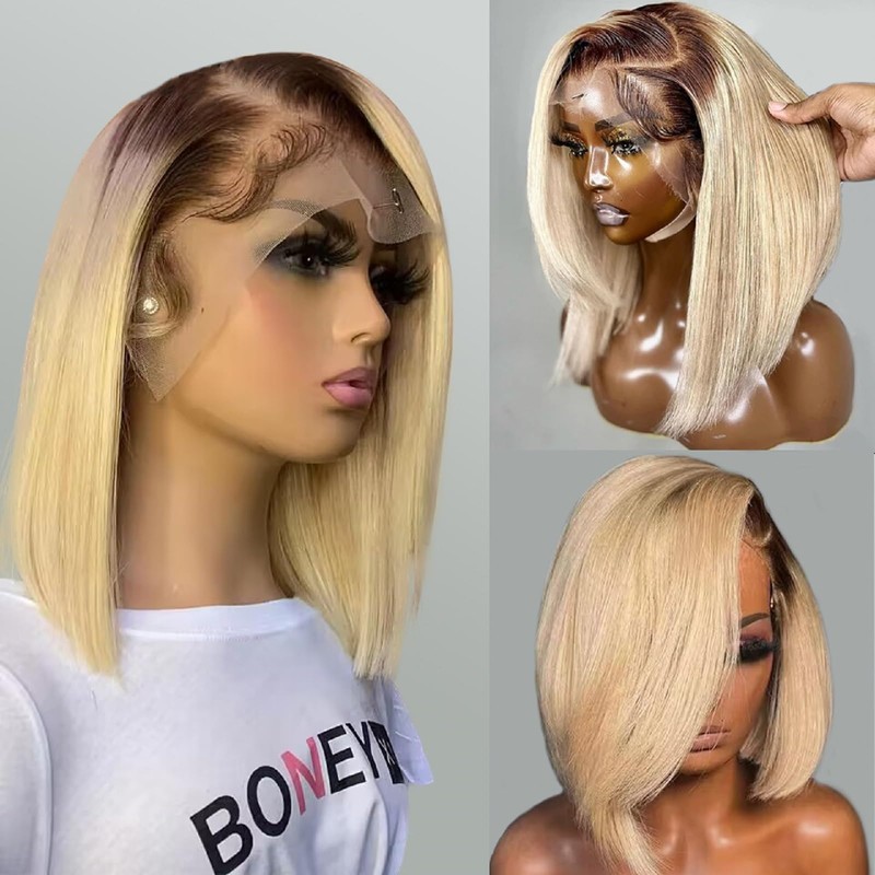 - 【Ombre Blonde BOB Lace Front Wigs Hair Material】: Pre Plucked Dark Roots 1BBlonde Bob Lace Wigs With Baby Hair Human Hair For Black Women,Select Top Grade 100% Unprocessed Human Virgin Hair,Cut From Young Girl One Donor, 100% True To Length. No Tangle ,No Shedding, Can Be Straightened, Curled,Bleached, Dyed and Permed