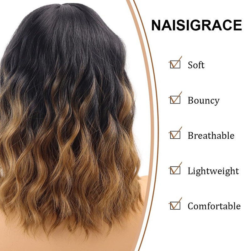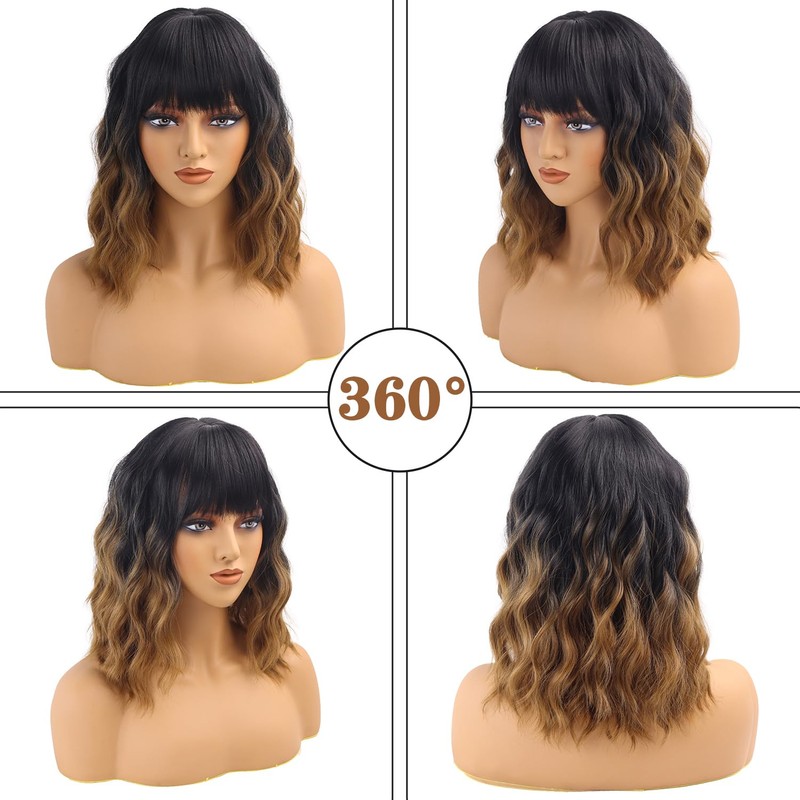 Ombre Brown Short Wavy Wigs with Bangs for Women Natural Looking Curly Bob Wig Shoulder Length Water Wave Wig Heat Resistant Synthetic Wig for Daily Party Use